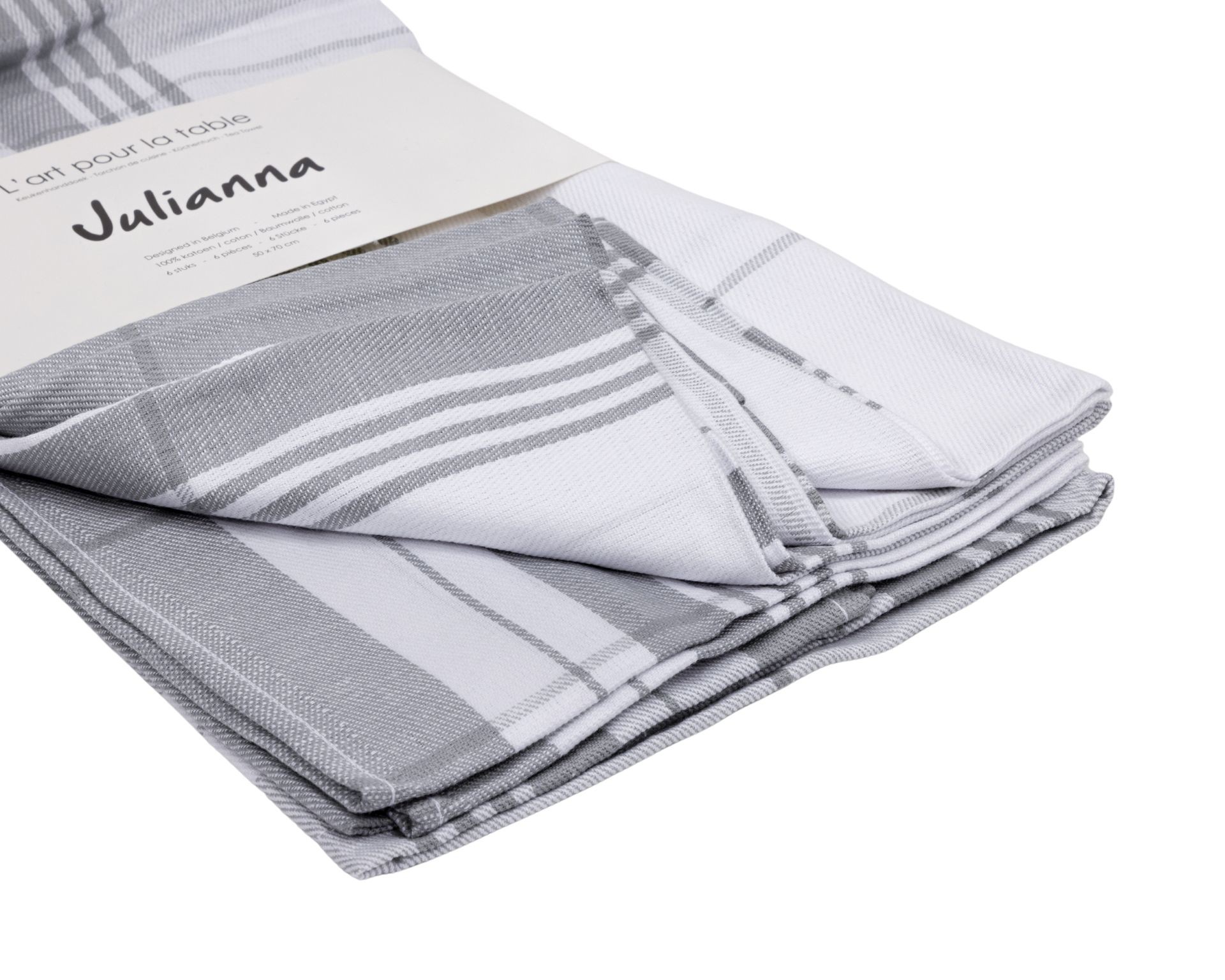 Deze kwaliteitskeukenhanddoeken zijn gemaakt uit 100% egyptisch katoen!!! In de kleuren jade (groen), sable en licht grijs Maat = 50x70 . Steeds per 6 verpakt.